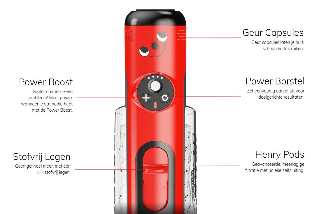 Met de Numatic Henry Quick stofzuig je grondig je tapijt en vloerkleden. De ronddraaiende borstel met harde haren in de combi zuigmond zijn handig voor het verwijderen van dierenharen. Je gebruikt de steelstofzuiger ook als kruimelzuiger. Je klikt hier gemakkelijk de kieren zuigmond en het combinatie-accessoire op. Je stofzuigt je plinten en maakt je meubels stof- en kruimelvrij met de accessoires. De steelstofzuiger heeft een accuduur van één uur. Na 4 uur is hij weer volledig opgeladen en klaar voor zijn volgende rondje. De meegeleverde pods zijn de filters en de stofzuigerzak van de steelstofzuiger. Ze drukken het stof samen, waardoor het stofreservoir ruim blijf. Hierdoor leeg je het stofreservoir minder vaak dan de meeste steelstofzuigers. Ook komt er geen stof vrij tijdens het legen. De geurcapsule laat via de uitblaaslucht een frisse geur achter.